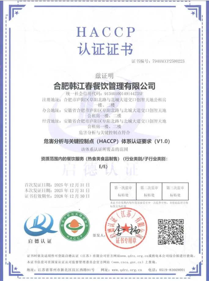 近日,合肥韓江春餐飲管理有限公司在管理體系與標準化建設領域取得重大突破,一次性成功通過涵蓋食品安全、質量管理、環境管理、職業健康安全、供應鏈安全及餐飲服務在內的七大權威體系認證。這標志著公司在規范化、精細化、可持續化運營方面邁上了全新臺階。